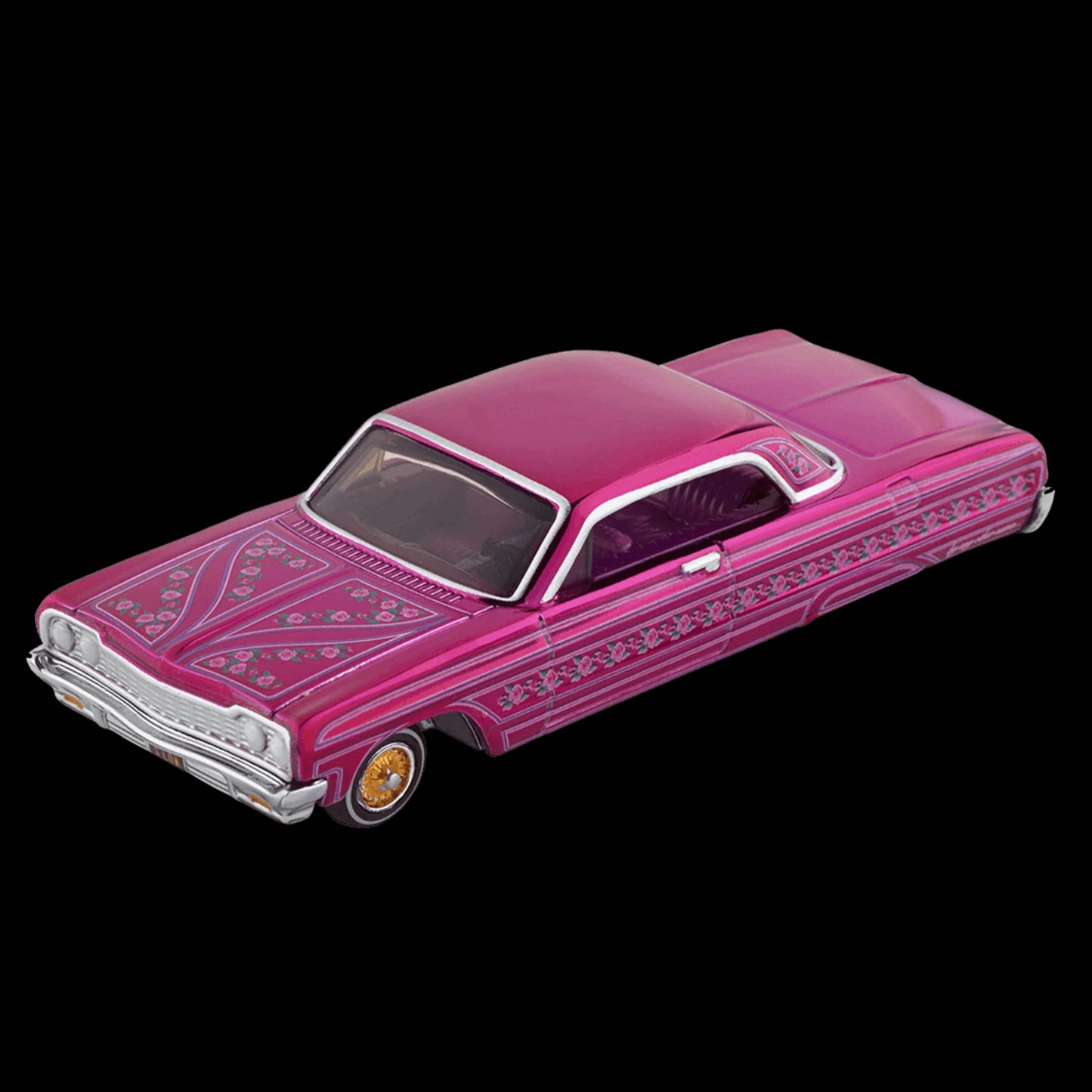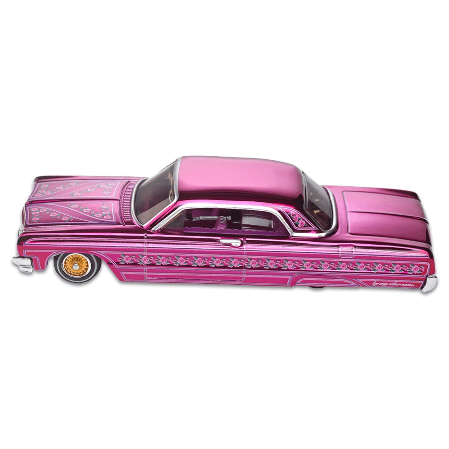 This piece is definitely a showstopper: from the intricate rose theme that adorns the car, to the painted details on the body and interior, to the debut of the new Real Riders Low Rider wheels, this rose has no thorns. The license plate may imply that our six-four is “S’LOW”, but you’ll have to be fast if you want one for yourself to show.