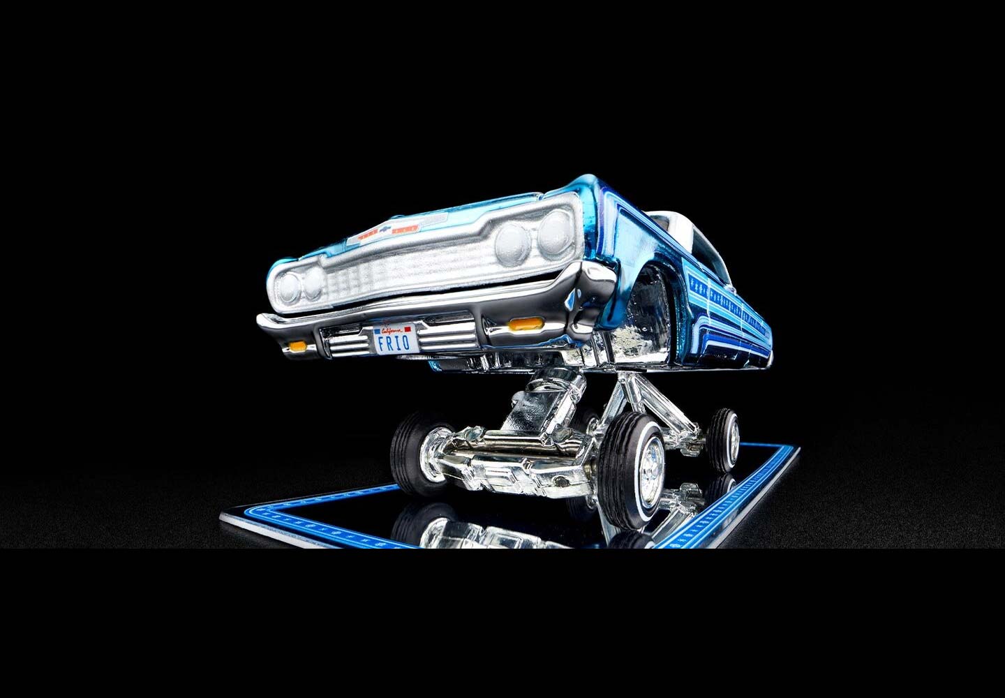 Dubbed “The Snowman,” this special RLC exclusive holiday edition ’64 Impala can dance up high, or appear to melt down low, with an adjustable/posable suspension. This 6-4 has an ice-cold, Spectraflame light blue paint job, snowflakes in the paint, and custom pinstriping – done by Vandervate, a former pinstriper himself. This Impala will give you chills … It's that cool!